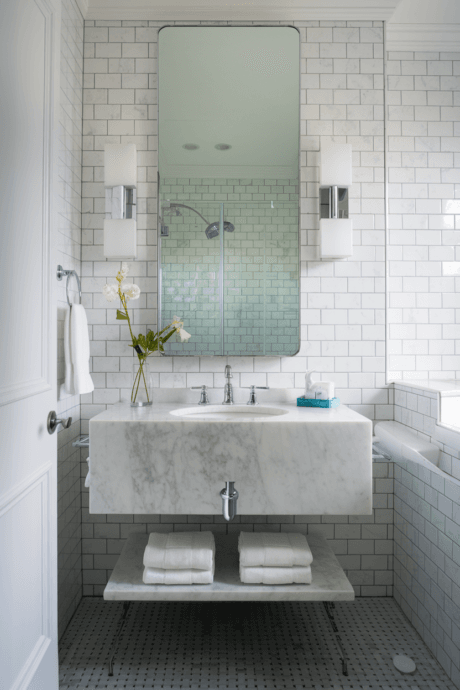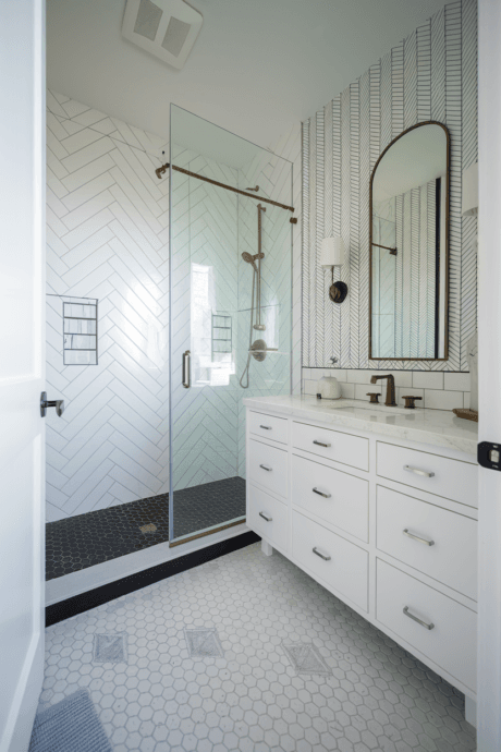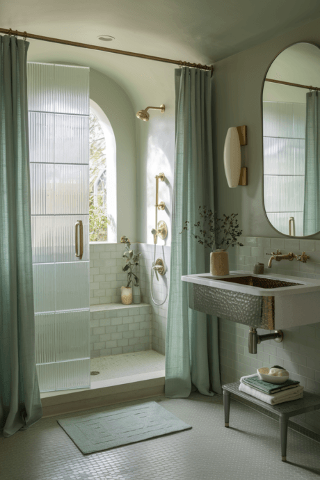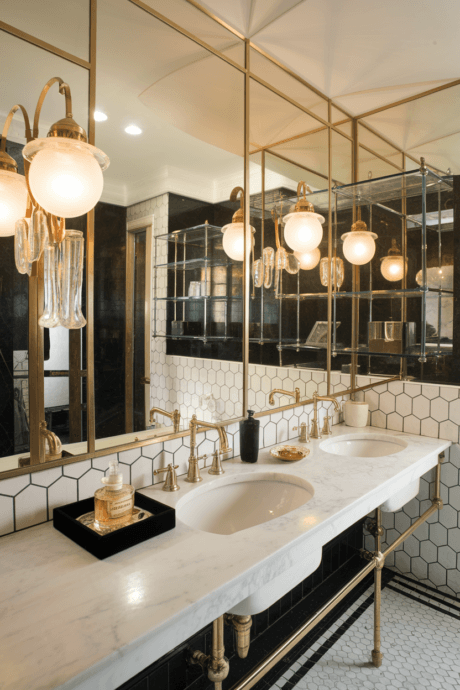 Revive the opulence of the 1920s with geometric patterns, bold contrasts, and luxurious materials. Black and white hexagonal tiles create a dramatic foundation, while gold fixtures and mirror frames add glamorous accents. Glass shelving, backlit mirrors, and wall sconces with frosted glass globes capture the era’s characteristic lighting. Complete the look with marble countertops, velvet details, and perhaps a vintage perfume tray.