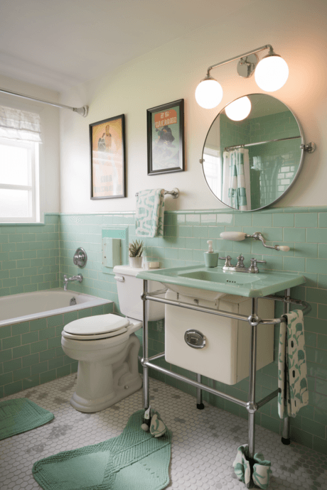 Embrace nostalgic charm with pastel tiles, vintage-inspired fixtures, and playful accessories that recall mid-century bathrooms. Mint green, pale pink, or sky blue tiles create a cheerful foundation, while white fixtures with chrome details maintain a classic look. Incorporate a medicine cabinet with a metal frame, a ceramic cup for toothbrushes, and perhaps framed vintage advertisements. Round mirrors, globe lighting, and color-coordinated textiles complete this whimsical aesthetic.