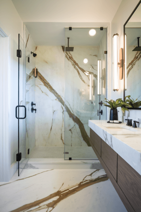 Create a spa-like retreat centered around beautiful natural stone with book-matched marble or onyx on shower walls, countertops, or even ceiling details. Minimal fixtures in finishes that complement the stone’s natural veining prevent competition with the material’s inherent beauty. Incorporate a floating vanity, integrated lighting, and perhaps a glass shower enclosure that fully showcases the stone. Accessories remain minimal and in harmony with the stone’s color palette.