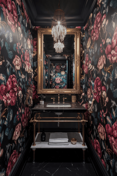 Transform a small powder room into a maximalist jewel box with bold wallpaper, dramatic lighting, and luxurious details. Dark floral or geometric patterns create an enveloping atmosphere, while a gold-framed mirror and matching fixtures add glamorous sparkle. Incorporate a small but impactful pendant light, perhaps a tiny marble shelf, and carefully chosen accessories like a decorative soap dish or small art piece. This space embraces drama through pattern and contrast.