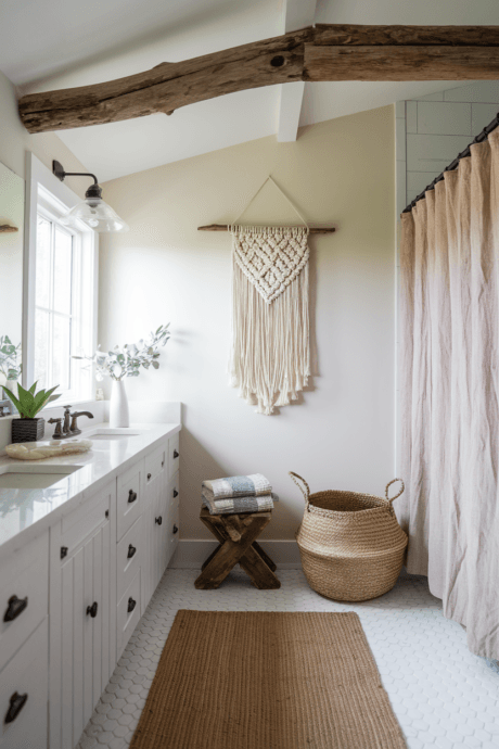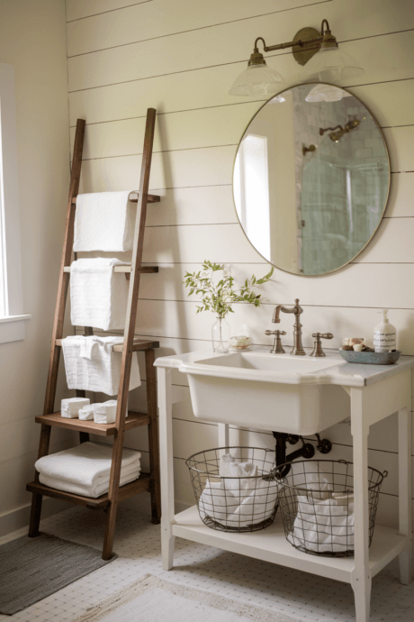 Create a cozy, inviting bathroom with reclaimed wood, vintage elements, and soft textures. A farmhouse sink, shiplap accent wall, and antique brass fixtures form the foundation of this charming aesthetic. Incorporate wire baskets, mason jar accessories, and perhaps a wooden ladder for towel storage. The color palette features warm whites, creams, and subtle earth tones, creating a timeless space that balances rustic elements with refined comfort.