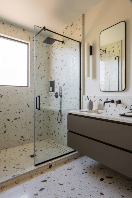 Embrace the playful sophistication of terrazzo with either traditional or oversized aggregate patterns on floors, shower walls, or countertops. This versatile material pairs beautifully with matte black fixtures and simple, geometric lighting. Incorporate a floating vanity, frameless mirror, and minimal accessories to let the terrazzo take center stage. The colorful specks in the material can inspire accent choices for towels and small accessories.