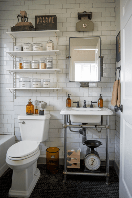 Capture the nostalgic charm of old-world pharmacies with subway tile, glass storage jars, and industrial touches. Open shelving displays carefully arranged essentials in glass containers with printed labels. Incorporate a medicine cabinet with a metal frame, black and white hexagonal floor tiles, and perhaps vintage advertisements as artwork. Amber glass accessories, a scale, and mortar and pestle decorative elements enhance the authentic, character-rich aesthetic.