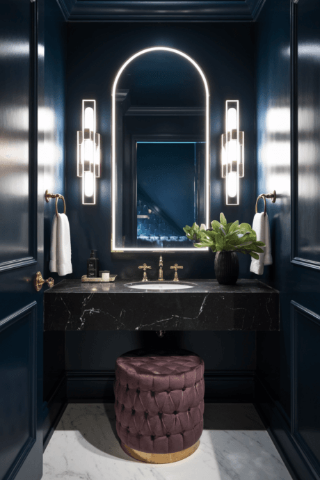 Embrace the bold sophistication of dark walls in navy, charcoal, or even black, creating a cocoon-like atmosphere of luxury. Gold or brass fixtures pop dramatically against the dark backdrop, while carefully placed lighting prevents the space from feeling gloomy. Incorporate plush textiles, perhaps a velvet stool, and a statement mirror with integrated lighting. Minimal but luxurious accessories in metallic finishes complete this dramatic, enveloping aesthetic.