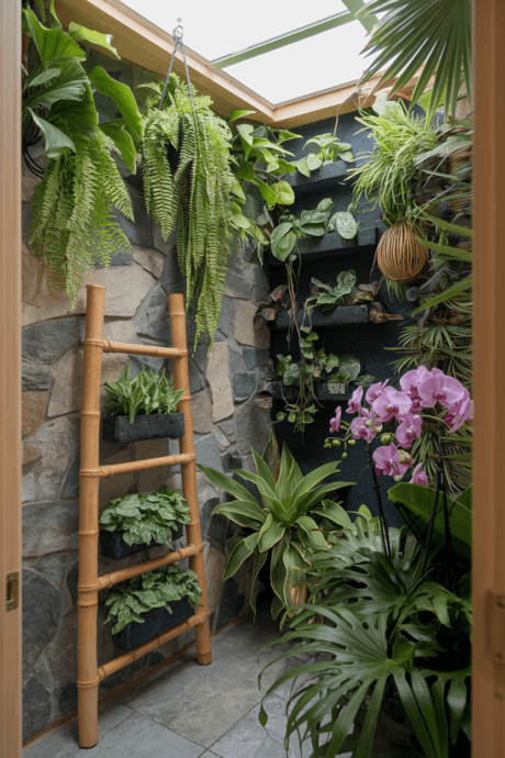 Transform your bathroom into a verdant retreat with abundant plants of varying heights, textures, and green hues. Wooden elements, stone accents, and perhaps a bamboo ladder create natural, organic backdrops for the greenery. Incorporate hanging planters, wall-mounted varieties, and moisture-loving specimens like ferns and orchids. A skylight or large window maximizes natural light, while accessories in natural materials enhance the biophilic design approach.
