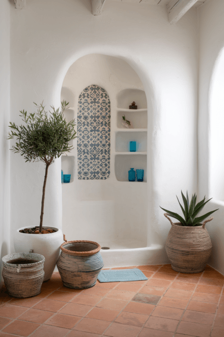Transport yourself to the sun-washed coasts of Greece or Italy with terracotta tiles, whitewashed walls, and azure accents. A built-in shower niche with handpainted tiles creates a stunning focal point. Incorporate curved archways, wrought iron elements, and perhaps a small potted olive tree or lavender plant. Woven baskets, ceramic vessels, and blue glass accessories complete this timeless, transportive aesthetic.