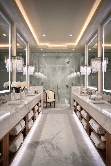 Recreate the indulgent experience of five-star accommodations with high-end materials, perfect symmetry, and thoughtful amenities. Marble countertops, backlit mirrors, and a glass-enclosed rainfall shower set the stage for luxury. Incorporate plush monogrammed towels, elegant dispensers for premium products, and perhaps a small seating area if space allows. Lighting plays a crucial role, with layers of illumination from recessed lights, sconces, and perhaps a statement chandelier.