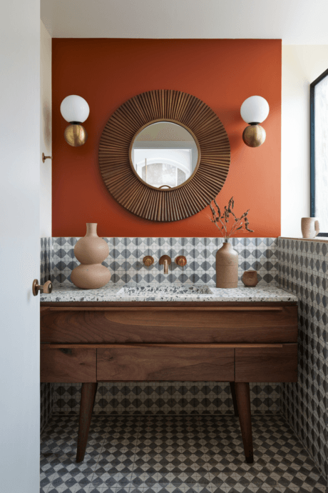 Capture the optimistic elegance of mid-century design with clean lines, organic shapes, and bold color accents. Walnut vanities with tapered legs, sunburst mirrors, and geometric tile patterns create authentic period charm. Incorporate lighting with brass stems and globe shades, terrazzo countertops or flooring, and perhaps one statement wall in burnt orange or avocado green. Accessories remain minimal but impactful, with ceramic vessels and abstract art completing the look.