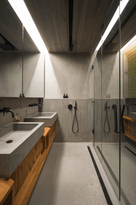 Embrace the cool sophistication of concrete with sleek formed basins, shower walls, and countertops for an architectural statement. Balance the coolness with warm wood accents, perhaps in floating shelves or a vanity base. Minimalist fixtures in matte black create striking contrast against the gray backdrop. Incorporate linear drains, frameless glass, and recessed lighting for a clean, uncluttered aesthetic that showcases the beauty of this versatile material.