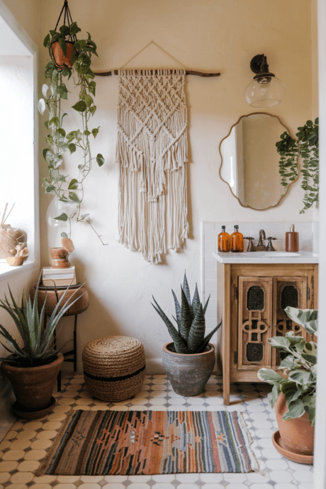 Create a free-spirited sanctuary with layered textures, global patterns, and collected treasures. Moroccan tiles, Turkish rugs, and macramé wall hangings add visual interest and personality. Incorporate warm woods, handmade pottery, and brass accents for authentic boho charm. Plants become essential design elements, with trailing vines and potted succulents bringing life to every corner. Amber glass accessories and vintage mirrors complete this eclectic, soul-warming space.