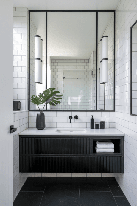Create architectural interest with black-framed shower enclosures, mirrors, and perhaps a window that creates a dramatic outline within the space. White walls and fixtures allow these graphic elements to pop dramatically. Incorporate matte black fixtures, minimal accessories, and perhaps one natural element like a wooden stool or plant for warmth. The high-contrast aesthetic creates a sophisticated, photography-ready space that balances boldness with restraint.