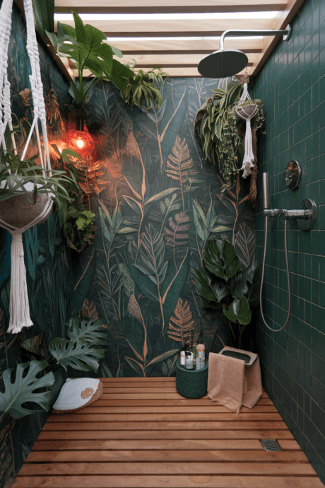 Transport yourself to an exotic destination with lush green plants, natural materials, and tropical-inspired prints. A wooden slatted shower floor and teak accents bring warmth, while botanical wallpaper or emerald tiles provide vibrant focal points. Incorporate rattan elements, macramé plant hangers, and natural stone accessories. Ambient lighting creates a sunset glow, transforming your bathroom into a personal resort spa experience.