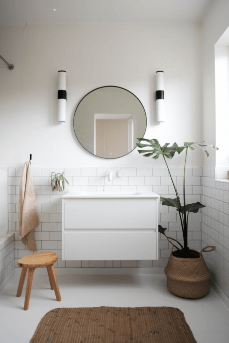Celebrate minimalist Nordic design with clean lines, functional simplicity, and abundant natural light. A muted palette of whites and soft grays creates a pristine backdrop for blonde wood accents and subtle texture. Incorporate a wall-mounted vanity with sleek hardware, a frameless mirror, and simple cylindrical lighting. Complete the look with a few carefully chosen accessories like a wooden stool, woven basket, and perhaps one striking plant.