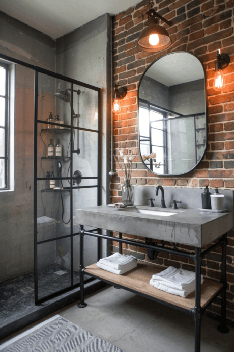 Embrace raw materials with exposed brick walls, concrete countertops, and black metal-framed shower enclosures for an urban industrial aesthetic. Incorporate vintage factory lights, pipe shelving, and distressed wood elements to enhance the utilitarian appeal. The color palette stays limited to grays, blacks, and warm browns with perhaps a single vibrant accent. Edison bulb fixtures and large factory-style mirrors complete this sophisticated urban retreat.