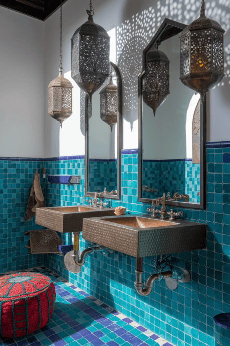 Create an exotic escape with vibrant Moroccan-inspired zellige tiles in jewel tones of turquoise, cobalt, and emerald. Pair with ornate bronze fixtures and a hammered metal sink for authentic charm. Incorporate carved wooden elements, a Moroccan pouf, and arched mirrors to enhance the aesthetic. Ambient lighting through perforated metal lanterns casts intricate shadow patterns, transforming your bathroom into a magical North African oasis.