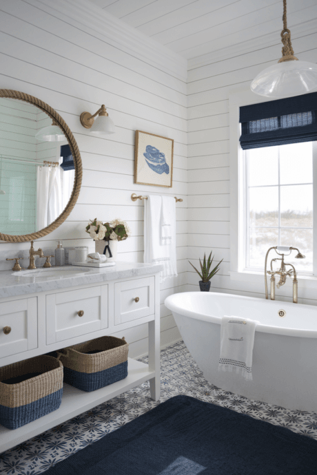 Capture the breezy sophistication of Hamptons style with white shiplap walls, navy blue accents, and brass fixtures. A freestanding oval tub becomes the centerpiece, complemented by plush white towels and seagrass baskets for storage. Blue and white patterned tiles add character without overwhelming the space. Complete the look with beach-inspired artwork and a large round mirror with a rope or white wooden frame.