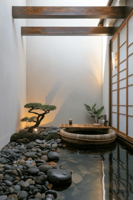 Transform your bathroom into a Japanese-inspired sanctuary with natural wood elements, a soaking tub, and minimalist fixtures. Incorporate bamboo accessories, smooth river stones, and a wooden bath mat for authentic touches. The key is creating harmony between natural elements and clean lines, with neutral colors promoting a sense of calm. Add subtle ambient lighting and perhaps a small bonsai plant to complete this tranquil aesthetic.