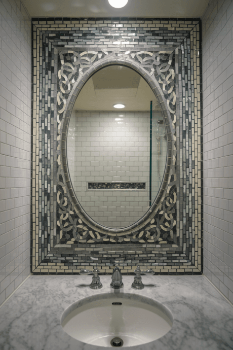 Create architectural definition by using mosaic tile “frames” to highlight specific bathroom areas like mirror surrounds, shower niches, or vanity backsplashes. These decorative borders use smaller tiles—often in contrasting colors or materials—to create outlined sections that organize the space and add designer detail. This technique allows for incorporation of more expensive specialty tiles in small quantities for maximum impact while maintaining budget-friendly field tile for larger areas, resulting in a custom look with practical cost management.