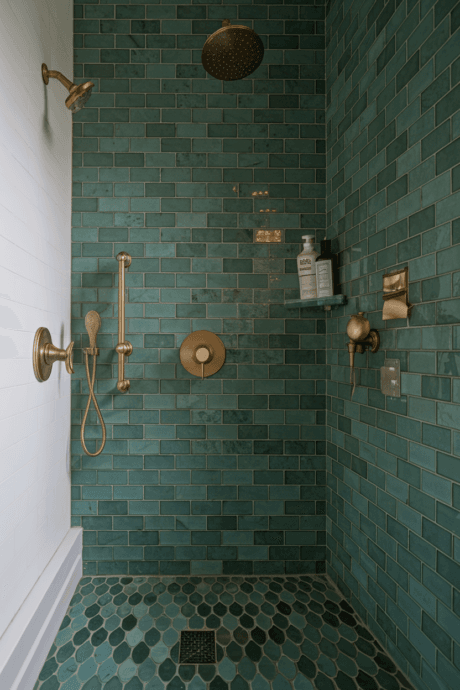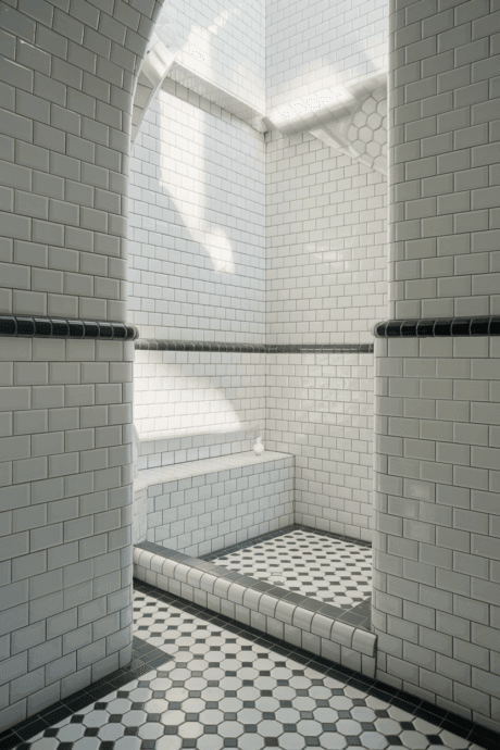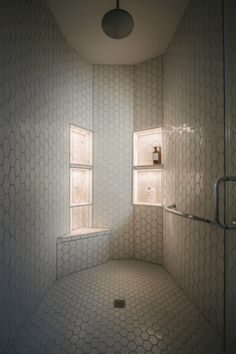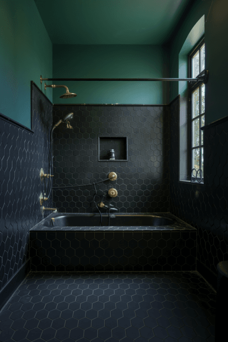 Make a bold, contemporary statement with matte black hexagon tiles that exude sophistication and drama. The non-reflective surface absorbs light rather than reflecting it, creating depth and intensity that glossy blacks can’t match. The geometric hexagon shape adds architectural interest, while the dark color conceals water spots and soap scum better than lighter alternatives. Pair with brass fixtures for luxurious contrast or white accessories for striking graphic impact.