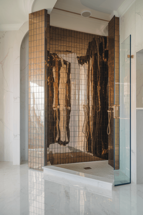 Add glamour and reflectivity with tiles featuring metallic finishes that range from subtle shimmer to bold high-shine surfaces. These light-catching tiles—available in gold, copper, bronze, silver, or iridescent options—create luxury and warmth while helping to bounce light around the room. Perfect for accent walls, shower niches, or backsplashes, metallic tiles create focal points that elevate the entire bathroom. Their reflective quality makes them particularly effective in smaller or darker bathrooms needing brightening.