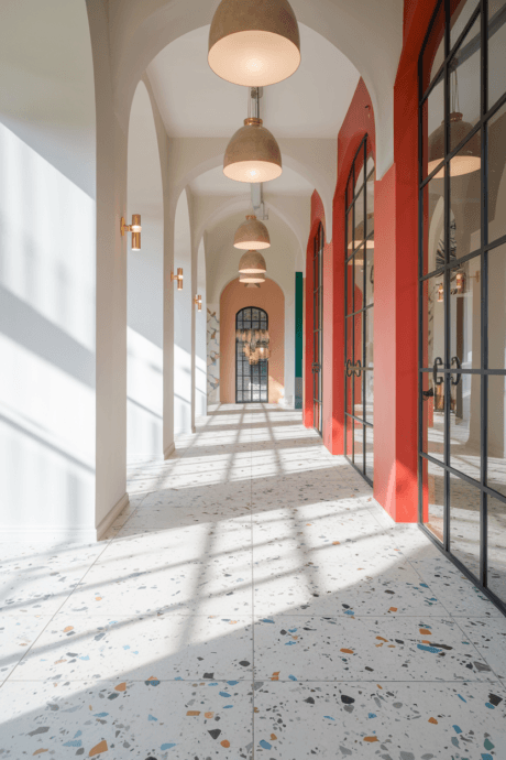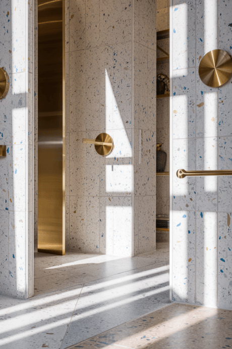 Bring mid-century modern flair to your bathroom with terrazzo tiles, featuring distinctive flecks of marble, quartz, glass, or other materials suspended in a cement or resin base. Contemporary terrazzo offers countless color combinations, from subtle neutrals to bold, colorful compositions. These durable tiles hide dirt well and create visual interest without overwhelming the space, making them perfect for both floors and statement walls in modern bathrooms seeking character.