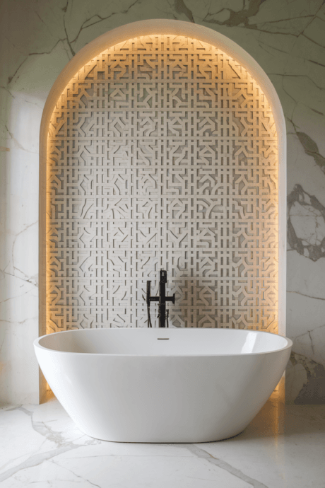 Create a luxurious focal point with laser-cut marble mosaic tiles featuring intricate patterns reminiscent of delicate lacework or Islamic geometric designs. These precision-cut stone pieces are often assembled into panels for easier installation, creating breathtaking feature walls behind freestanding tubs or within shower niches. The combination of fine detailing and natural stone quality creates an artistic statement piece that epitomizes bespoke luxury while the neutral stone palette ensures timeless elegance.