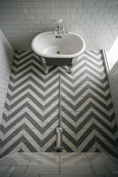 Add dynamic movement to bathroom floors with tiles arranged in a chevron pattern, featuring rows of rectangles set at 45-degree angles creating a continuous zigzag. More dramatic than herringbone with its distinctive “arrows,” chevron makes a bold geometric statement that adds architectural sophistication. This pattern can make narrow bathrooms appear wider and creates visual flow that draws the eye through the space, particularly effective when used with high-contrast grout or two-tone tile combinations.