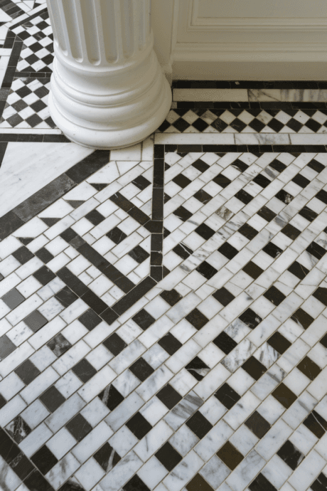 Introduce classic elegance with basketweave mosaic floors combining marble in two contrasting colors. This traditional pattern features rectangular pieces arranged to create the illusion of interwoven strands, adding sophisticated texture and visual interest. The timeless black-and-white combination works in virtually any bathroom style from traditional to transitional, while the small-scale pattern provides practical slip resistance in wet areas while disguising dirt between cleanings.