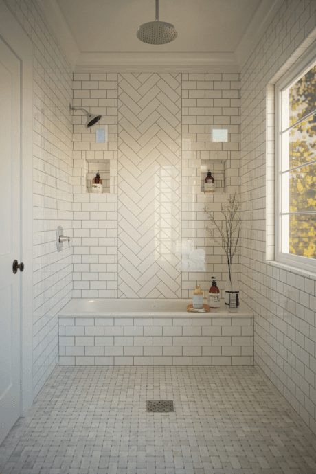 Elevate classic subway tiles by arranging them in a dynamic herringbone pattern that adds movement and sophistication. This zigzag arrangement transforms simple rectangular tiles into an eye-catching feature that draws the eye and creates a sense of expanded space. Perfect for shower walls or as a tub surround, this pattern works equally well with traditional white tiles for subtle texture or with colored tiles for more dramatic effect.