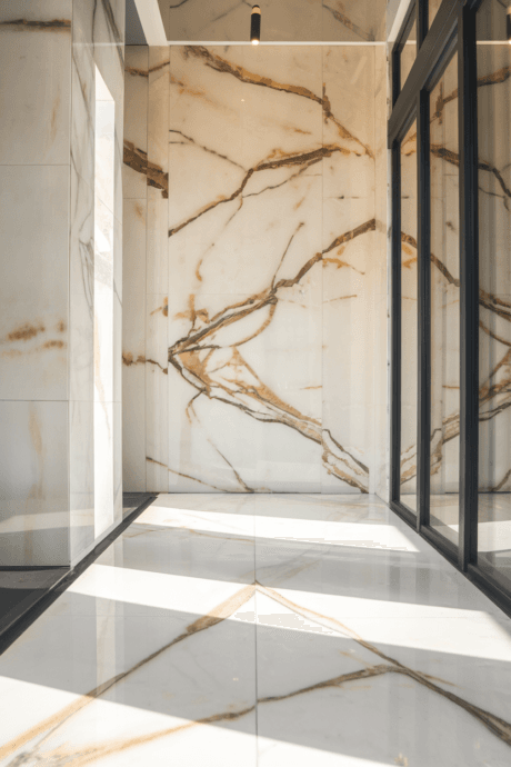 Achieve luxurious marble aesthetics with practical porcelain slabs that realistically mimic high-end stones like Calacatta or Statuario. Advanced printing technology captures authentic veining patterns while eliminating marble’s maintenance concerns and vulnerability to etching and staining. These large-format tiles create dramatic, seamless shower surrounds with minimal grout lines, offering the ultimate combination of opulent appearance and practical performance. The consistent patterning also allows for book-matching, creating mirror-image installations for truly custom-looking results.