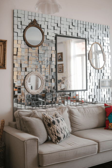 Create a captivating focal point with a collection of mirrors in different shapes, sizes, and frames arranged in a free-form mosaic. Mix ornate gilt frames with simple wooden ones, circular shapes with rectangles and asymmetrical forms. Beyond making your space appear larger and brighter, this arrangement creates fascinating reflections that change throughout the day. The kaleidoscopic effect embodies the bohemian love for visual complexity and unexpected beauty.