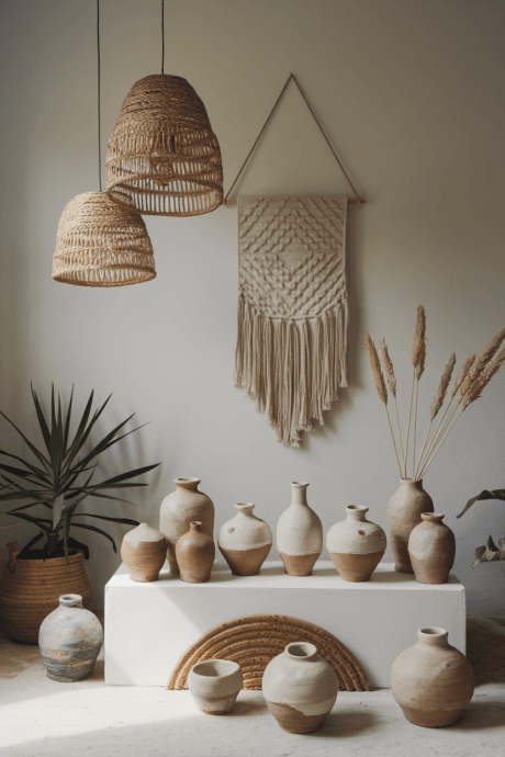 Display artisanal ceramics with organic forms, interesting glazes, and visible hand-touched qualities. Mix pieces with different functions—vases, bowls, platters—and display them on open shelving or clustered as table centerpieces. The earthiness of clay connects to bohemian values of natural materials, while supporting independent artists aligns with bohemian ethics. Look for pieces with interesting textures, drip glazes, or subtle imperfections that celebrate the beauty of the handmade in our mass-produced world.