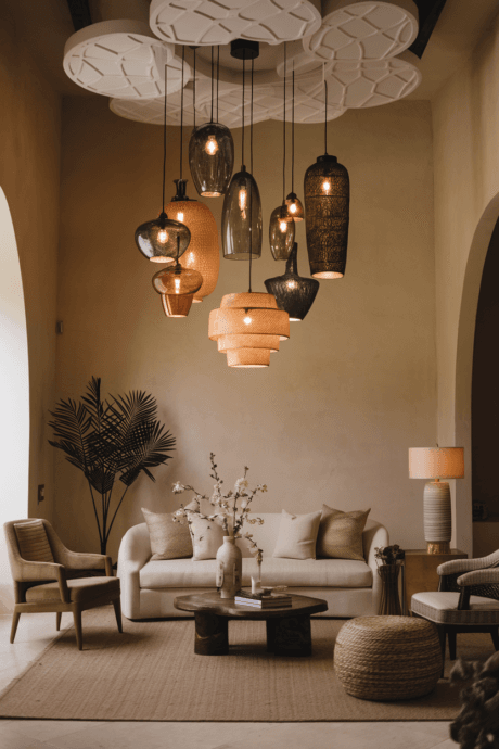 Create dramatic visual interest with clustered pendant lights at varying heights. Mix materials and styles—glass, metal, woven, and beaded—in complementary colors for eclectic harmony. This unconventional lighting arrangement becomes a sculptural element even when turned off. Position the cluster over conversation areas or in corners that need highlighting. The layered illumination creates magical ambiance in the evening, casting intriguing shadows and warm light perfect for the intimate gatherings beloved in bohemian homes.