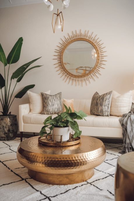 Combine different metallic finishes—brass, copper, silver, and gold—for a collected, eclectic look. Think hammered brass coffee tables, copper plant pots, silver candlesticks, and gold-framed mirrors all coexisting harmoniously. The reflective quality of these surfaces adds warmth and light to your space, while the mixed finishes create that perfect imperfect look that’s essential to boho style. Focus on pieces with handcrafted textures rather than high-polish finishes for authentic bohemian character.