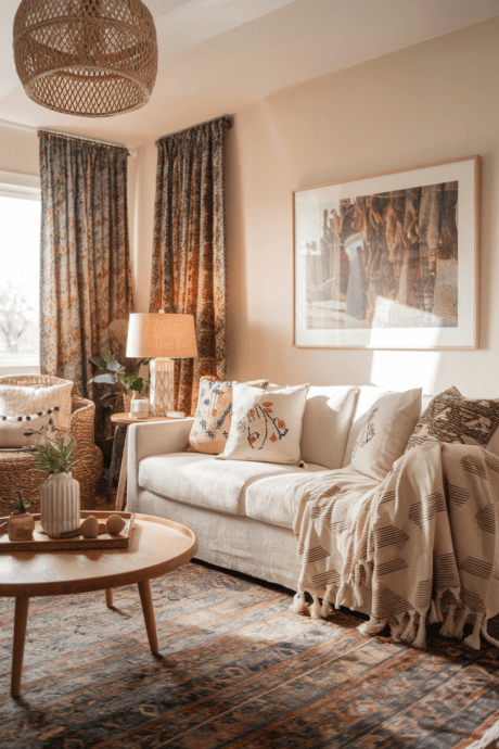 Transform your living room into a tactile haven by layering textiles of different textures and patterns. Start with a neutral base sofa, then pile on embroidered throw pillows, tasseled blankets, and a vintage Persian or Moroccan rug. The key is mixing patterns confidently—combine florals with geometrics and ethnic prints. This creates depth and visual interest while maintaining that signature bohemian coziness that makes everyone want to sink in and stay awhile.