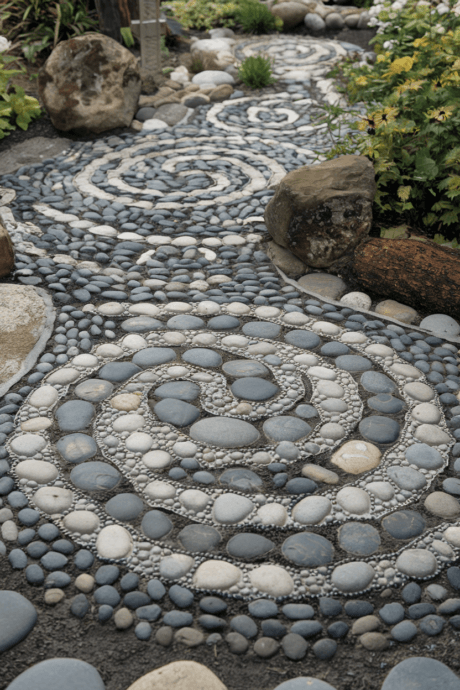 Create permanent garden artwork by designing mosaic patterns using small stones and pebbles set in concrete. Incorporate meaningful symbols, spirals, or geometric designs that reflect your personal style. These functional art pieces guide garden visitors while providing visual interest underfoot. The natural stone colors bring subtle beauty that ages gracefully.