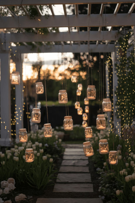 Create a magical overhead canopy by suspending dozens of mason jars from a pergola or between trees. Fill some with solar fairy lights, others with tea lights, and some with small plants or flowers. The mixed contents create varied light effects after sunset, transforming your garden into an enchanted evening retreat.