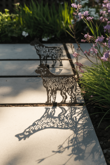Design flat metal cutouts mounted on stakes that cast intricate shadows across garden paths and walls. Create silhouettes of animals, plants, or abstract patterns that transform throughout the day as the sun changes position. These simple art pieces create twice the visual interest—both the physical form and its projected shadow.