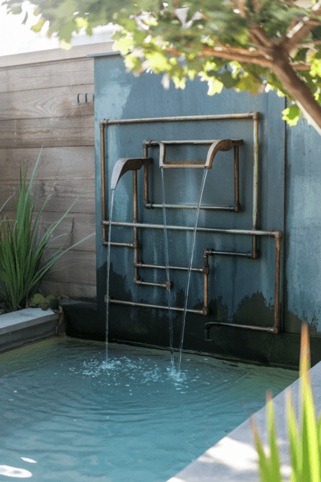 Craft a modern sculptural fountain using copper pipes arranged in geometric or organic patterns. The warm metallic tones develop a beautiful patina over time while providing the soothing sound of flowing water. Position this feature where afternoon sun can illuminate the water as it cascades through the copper elements.