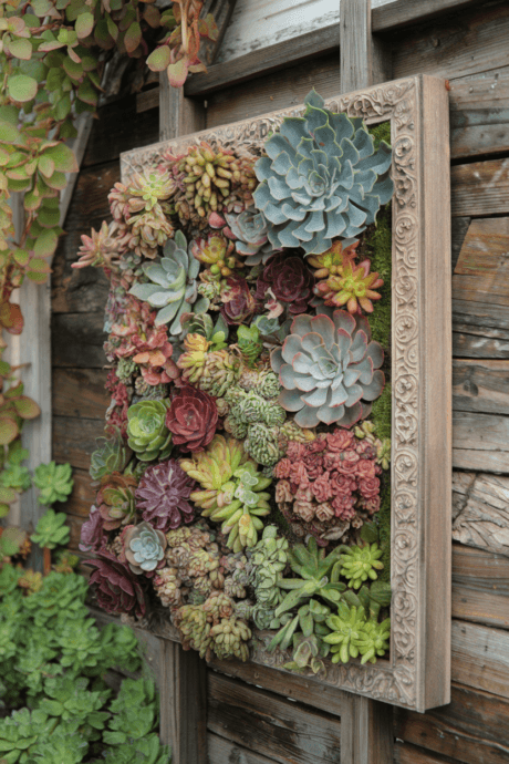 Create vertical garden masterpieces using succulent plants arranged in shallow frames. These living paintings require minimal water and maintenance while offering incredible texture and color variation. Mount them on fences or exterior walls for dramatic visual impact. Design geometric patterns, mandalas, or even representational images using different succulent varieties.