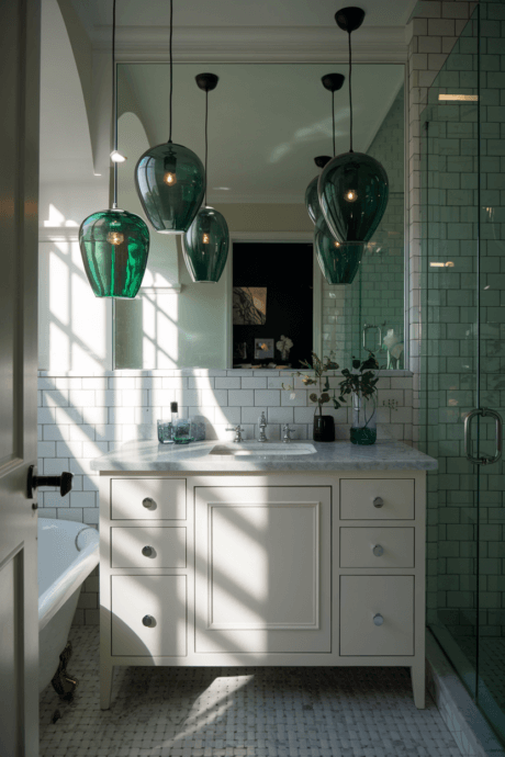 Illuminate your bathroom with statement green glass pendant lights that combine functionality with artistic expression. The colored glass casts a gentle green glow throughout the space, creating ambiance while serving as jewelry for your bathroom design. Hang at varying heights over a vanity or as bedside a bathtub for dramatic effect. The translucent quality allows light to play through the colored glass, adding another dimension of green to your color palette through light itself.