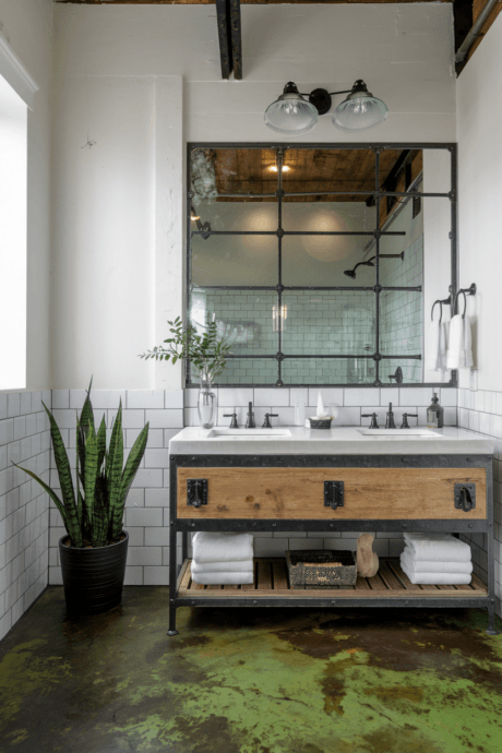 Create an industrial-chic foundation with green stained concrete floors that offer seamless, waterproof durability with artistic appeal. This technique allows the concrete’s natural variations to show through the translucent green stain, resulting in a one-of-a-kind patina effect. The smooth surface provides practical benefits for bathroom environments while the earthy green tone warms what could otherwise feel cold. Seal with a non-slip finish for safety and complement with natural wood and metal elements.