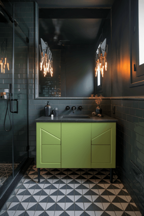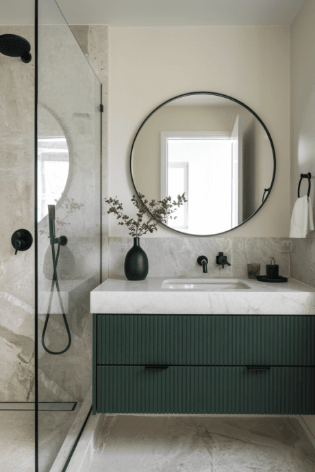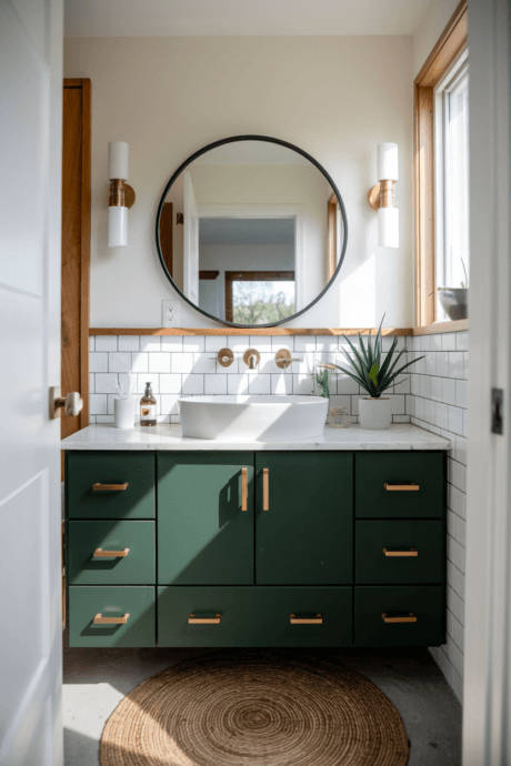 Transform an ordinary bathroom with a forest green vanity cabinet that serves as both a functional storage solution and a striking design element. This deeper shade anchors the space while offering a perfect balance of classic and contemporary style. Top with a contrasting marble or quartz countertop for elegance. Complete the look with simple hardware in brass or chrome, allowing the rich green color to remain the star of your bathroom’s design story.