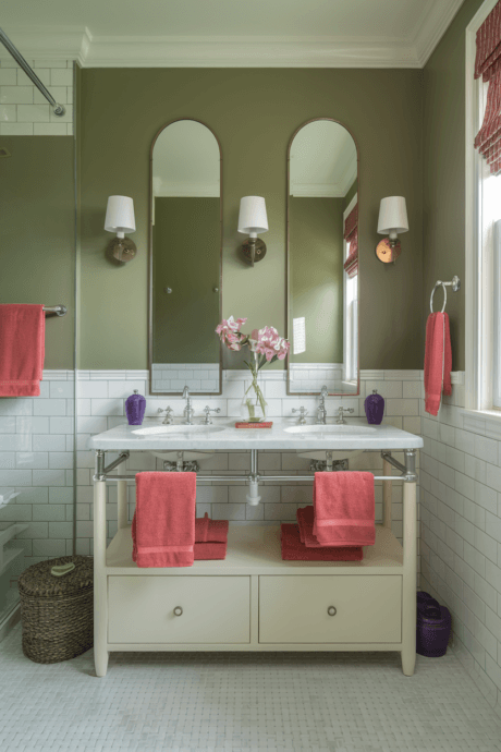 Create visual harmony using a split complementary color scheme with green as your base color, accompanied by shades adjacent to its complement on the color wheel—think green with coral and violet accents. This sophisticated color theory approach provides balanced contrast without the intensity of direct complementary colors. Apply green to main surfaces, then incorporate the accent colors through accessories, artwork, or small tiles. This creates a bathroom with perfect color tension and balance.