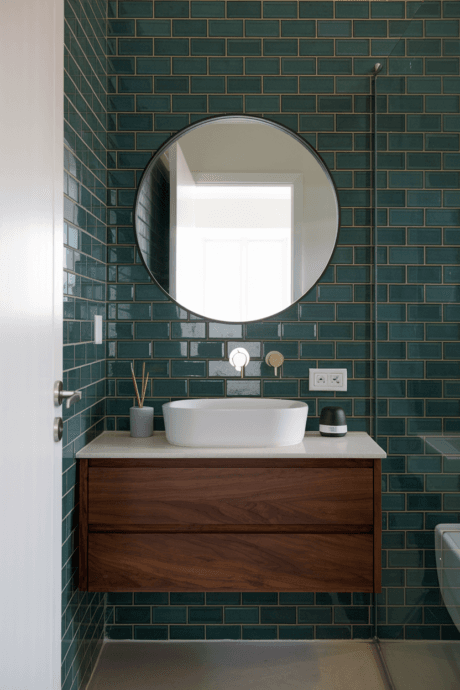 Create the illusion of height with vertically stacked green rectangular tiles that draw the eye upward, making ceilings appear higher and spaces feel larger. This contemporary installation technique refreshes the classic subway tile by changing its orientation from horizontal to vertical. Choose varying shades of green in a random or ombré pattern for added interest, or stick with a single verdant hue for elegant simplicity. This approach works particularly well in shower enclosures and behind vanities.