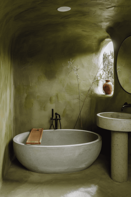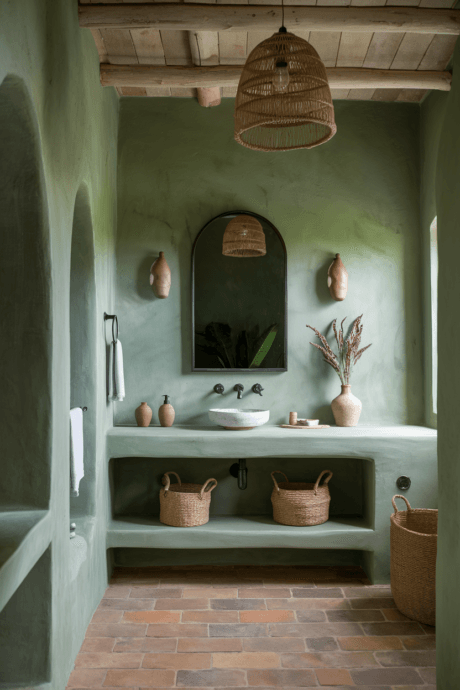 Add dimension and organic appeal with moss green textured plaster walls that bring the tactile quality of nature indoors. This old-world finishing technique creates subtle variations in both color and texture, absorbing and reflecting light differently throughout the day. The earthiness of moss green paired with the handcrafted feel of troweled plaster results in walls that feel alive and organic. This treatment creates a perfect backdrop for both minimal modern fixtures and vintage-inspired bathroom elements.