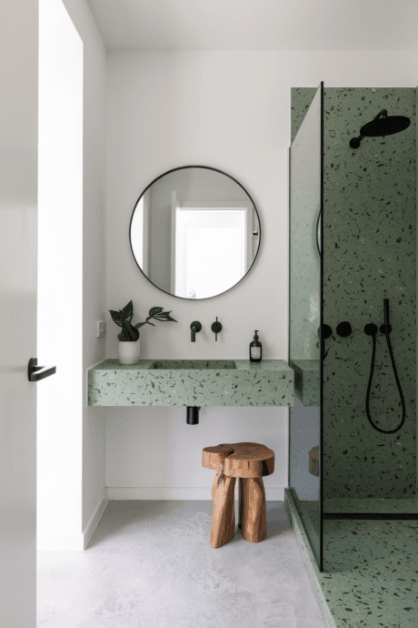 Incorporate playful yet sophisticated green terrazzo for countertops, shower surrounds, or flooring. This composite material featuring green marble chips suspended in cement or resin creates a distinctive speckled appearance that’s both retro and modern. Choose a base with varying shades of green fragments for a cohesive look that still offers visual texture and depth. This durable, low-maintenance surface brings artistic flair to functional spaces while its flecked pattern helps camouflage water spots between cleanings.