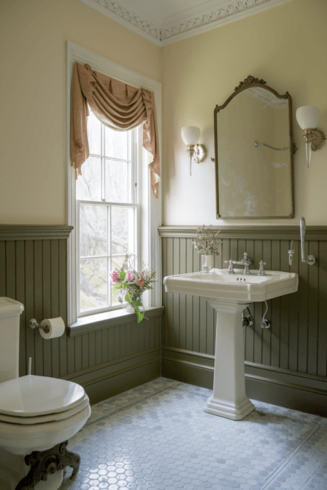 Bring architectural detail and rich color to your bathroom with artichoke green wainscoting that adds traditional character with contemporary appeal. This mid-height wall treatment provides practical protection while creating visual interest through its paneled design. The distinctive green shade—neither too yellow nor too blue—complements a variety of design styles from classic to transitional. Paint upper walls white or cream for contrast, or take the green color all the way up for a more enveloping, dramatic effect.