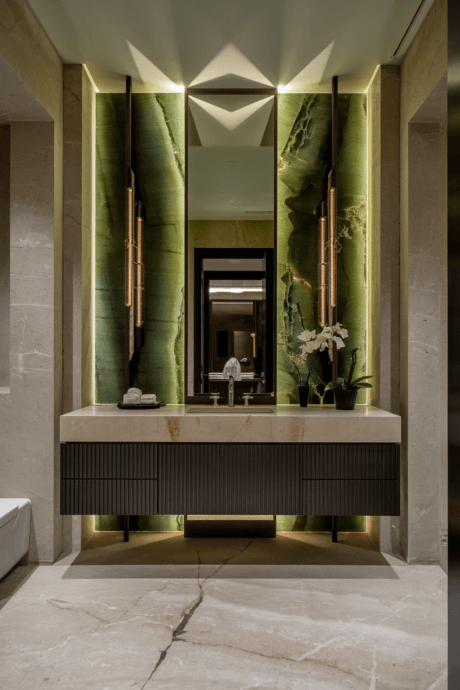 Create a stunning natural art installation with a green onyx feature wall that showcases the stone’s translucent quality and distinctive veining. When backlit, this semi-precious stone glows from within, highlighting its unique patterns and varying green tones. Use as a shower wall or behind a vanity for maximum impact. This luxury element transforms an ordinary bathroom into an extraordinary space with one-of-a-kind natural beauty that feels both organic and opulent.
