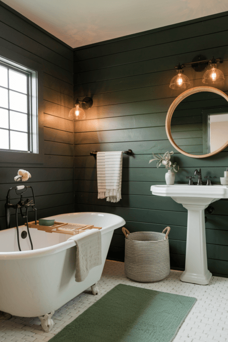 Add architectural interest and depth with dark green shiplap walls that bring texture and dimension to your bathroom. The horizontal wooden boards painted in forest or hunter green create a cozy, enveloping atmosphere with subtle shadow lines between each plank. This treatment works beautifully in both modern farmhouse and contemporary designs, pairing especially well with white fixtures and natural wood elements. The technique adds character while the rich green color grounds the space in natural elegance.